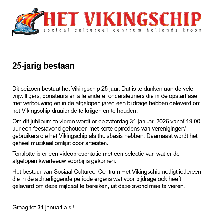 Welkom op de website van het Vikingschip. Het Vikingschip is een sociaal cultureel centrum in de gemeente Hollands Kroon. Het biedt onderdak aan vele verenigingen en stichtingen en biedt een keur aan mogelijkheden voor het huren van een ruimte of zaal. Het podium in de grote zaal geeft verenigingen en theatergezelschappen een plek waar hun prestaties op een prachtige manier worden uitgelicht.